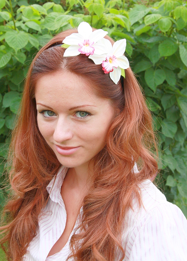 Have made a headband with white orchids for my younger sister. It is very similar to the one I showed you some time ago.